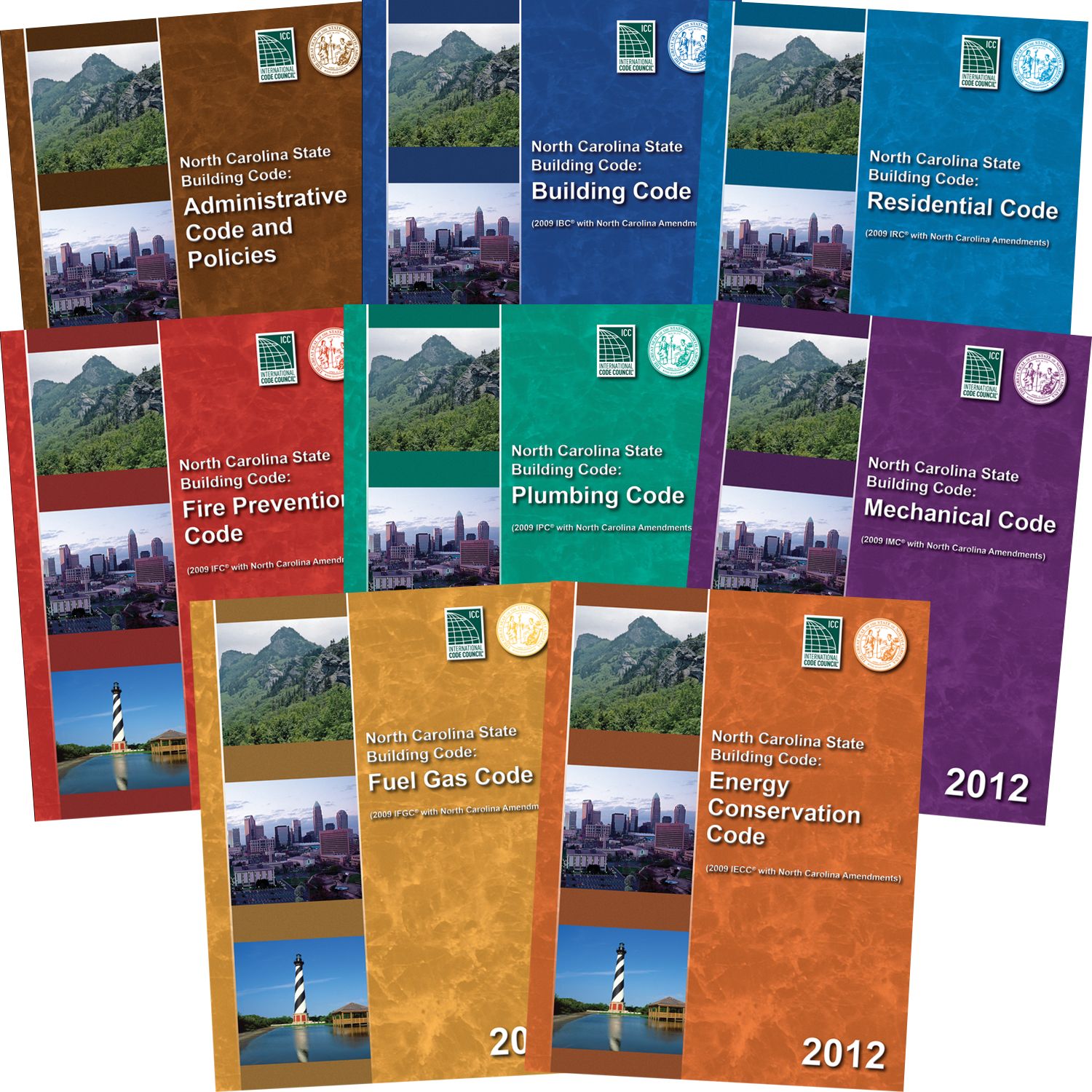 2012 North Carolina editions of: Administrative Code and Policies, Building Code, Residential Code, Fire Prevention Code, Plumbing code, Mechanical Code, Fuel Gas Code, and Energy Conservation Code.
