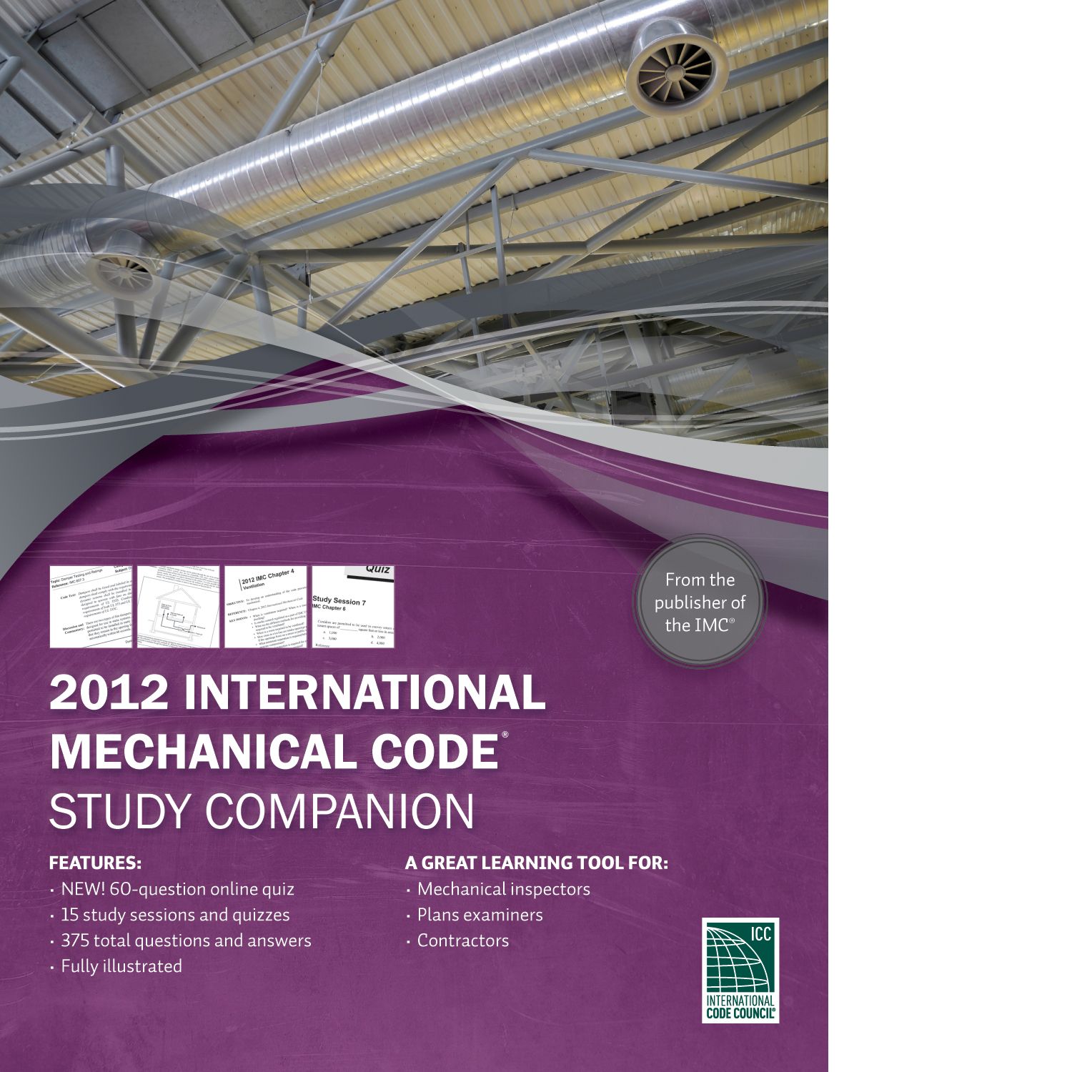 The 2012 International Mechanical Code Study Companion is an essential study guide to help you better understand the 2012 International Mechanical Code® (IMC®). It covers central topics of the code and includes code text, code clarification and illustrations representing the provisions under discussion.