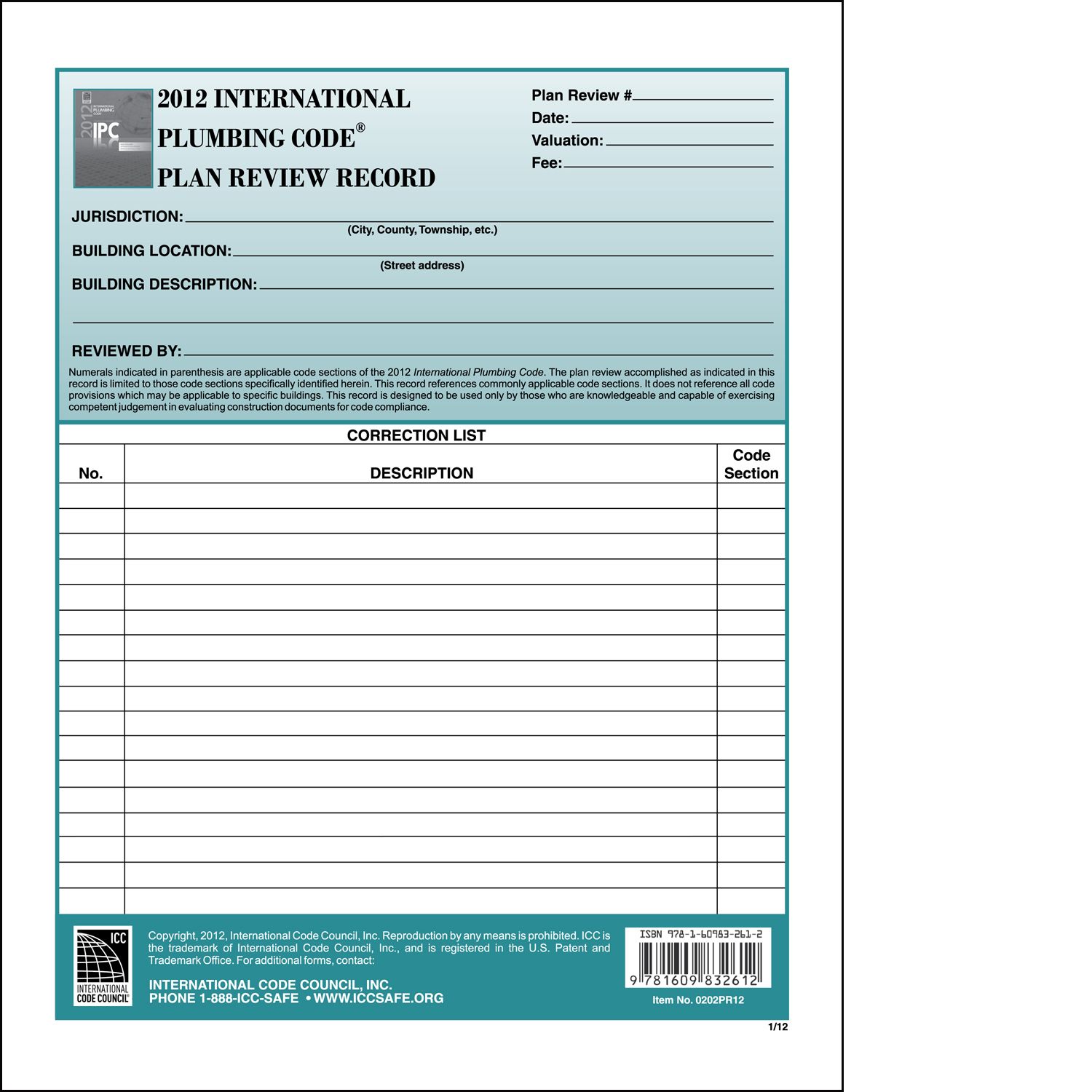 A thorough checklist of applicable code sections from the 2012 International Plumbing CodeĀ®. The Plan Review Records is an essential resource to conduct detailed, consistent plan reviews. Sold in sets of 10