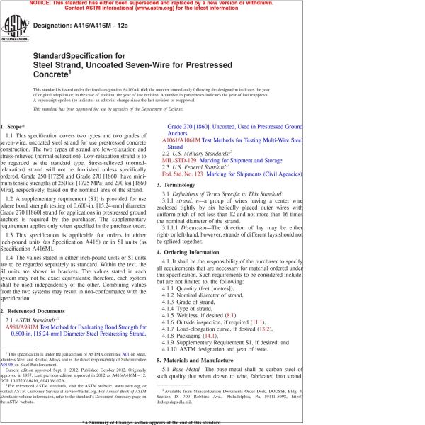 1.1 This specification covers two types and two grades of seven-wire, uncoated steel strand for use prestressed concrete construction. The two types of strand are low-relaxation and stress-relieved (normal-relaxation). Low-relaxation strand is to be regarded as the standard type. Stress-relieved (normal-relaxation) strand will not be furnished unless specifically ordered. Grade 250 [1725] and Grade 270 [1860] have minimum tensile strengths of 250 ksi [1725 MPa] and 270 ksi [1860 MPa], respectively, based on the nominal area of the strand.