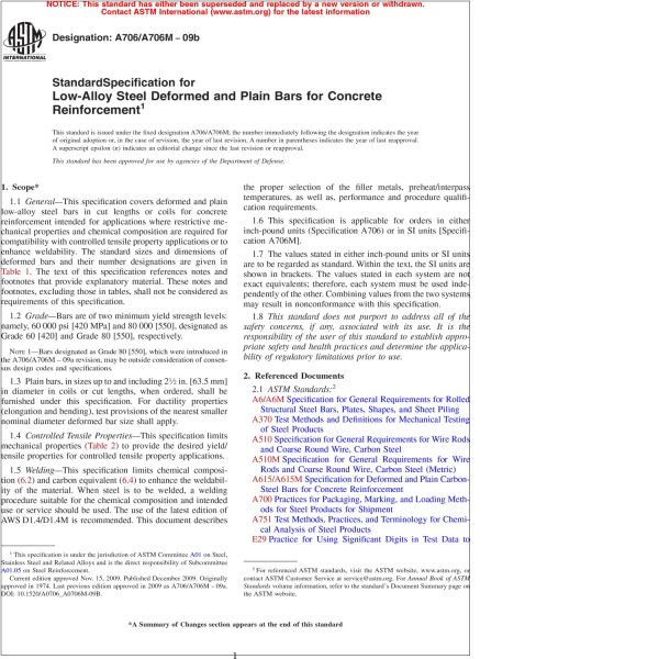 1.1 General—This specification covers deformed and plain low-alloy steel bars in cut lengths or coils for concrete reinforcement intended for applications where restrictive mechanical properties and chemical composition are required for compatibility with controlled tensile property applications or to enhance weldability. The standard sizes and dimensions of deformed bars and their number designations are given in Table 1. The text of this specification references notes and footnotes that provide explanatory material. These notes and footnotes, excluding those in tables, shall not be considered as requirements of this specification.