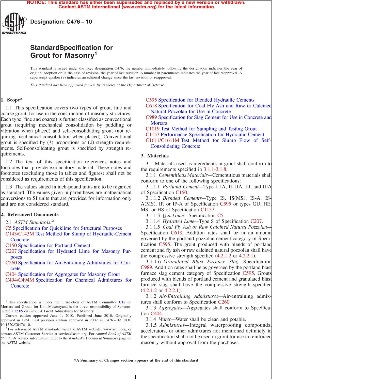 1.1 This specification covers two types of grout, fine and coarse grout, for use in the construction of masonry structures. Each type (fine and coarse) is further classified as conventional grout (requiring mechanical consolidation by puddling or vibration when placed) and self-consolidating grout (not requiring mechanical consolidation when placed). Conventional grout is specified by (1) proportions or (2) strength requirements. Self-consolidating grout is specified by strength requirements.