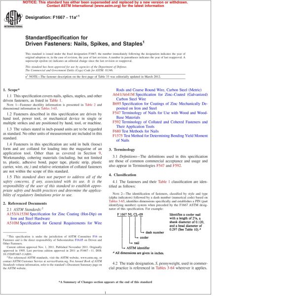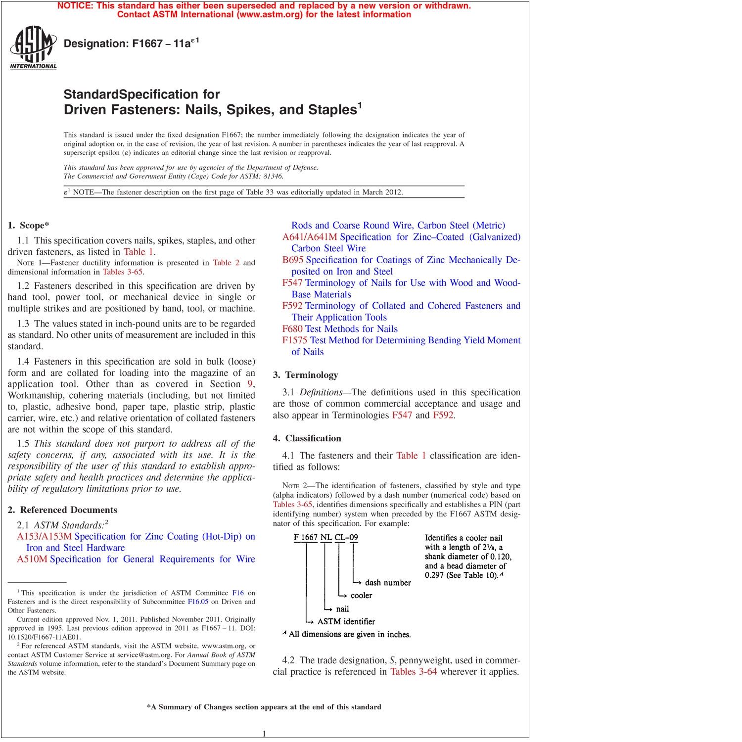 1.1 This specification covers nails, spikes, staples, and other driven fasteners, as listed in Table 1.