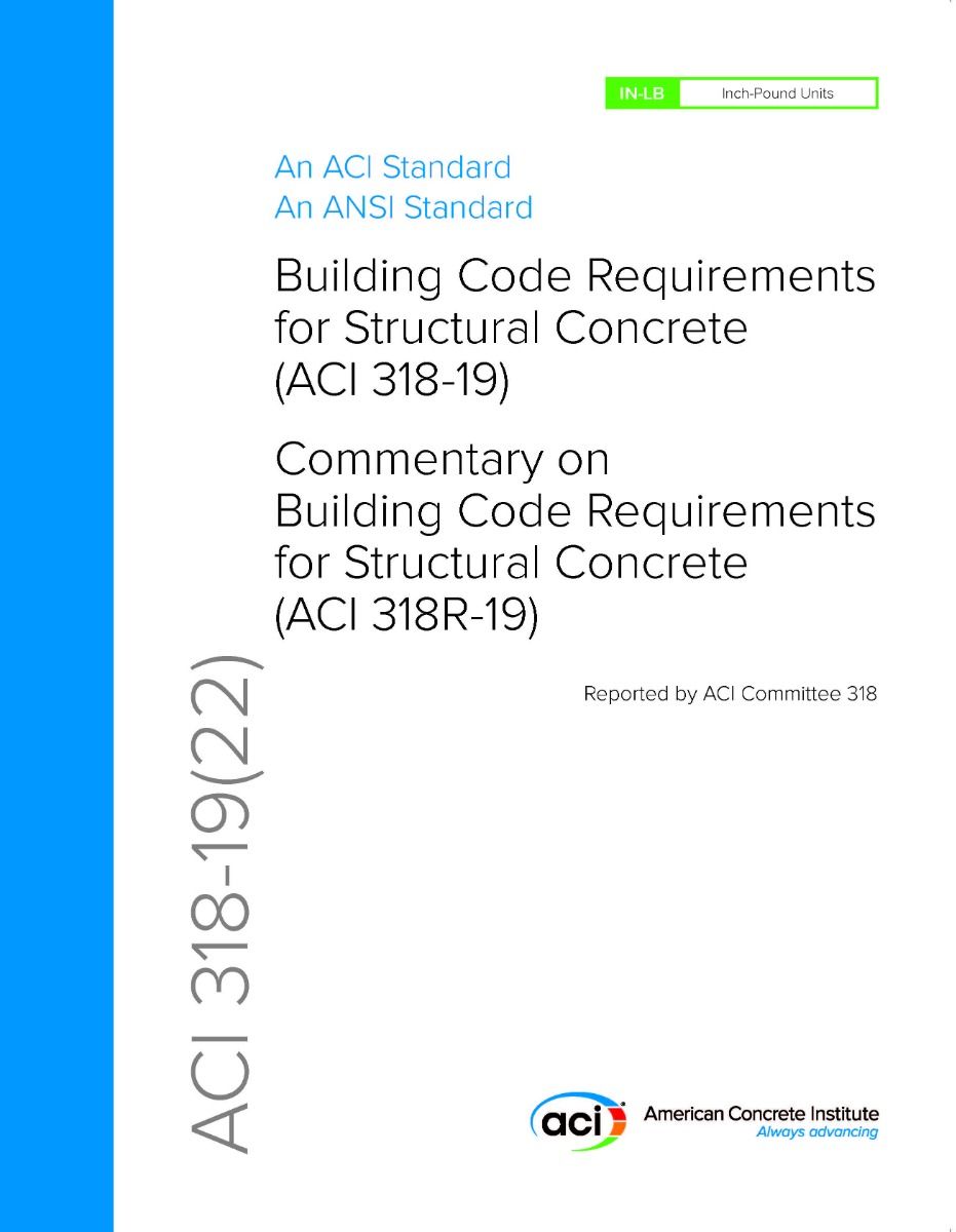 The "Building Code Requirements for Structural Concrete" ("Code") provides minimum requirements for the materials, design, and detailing of structural concrete buildings and, where applicable, nonbuilding structures. This Code was developed by an ANSI-approved consensus process and addresses structural systems, members, and connections, including cast-in-place, precast, shotcrete, plain, nonprestressed, prestressed, and composite construction. Among the subjects covered are: design and construction for strength, serviceability, and durability; load combinations, load factors, and strength reduction factors; structural analysis methods; deflection limits; mechanical and adhesive anchoring to concrete; development and splicing of reinforcement; construction document information; field inspection and testing; and methods to evaluate the strength of existing structures.