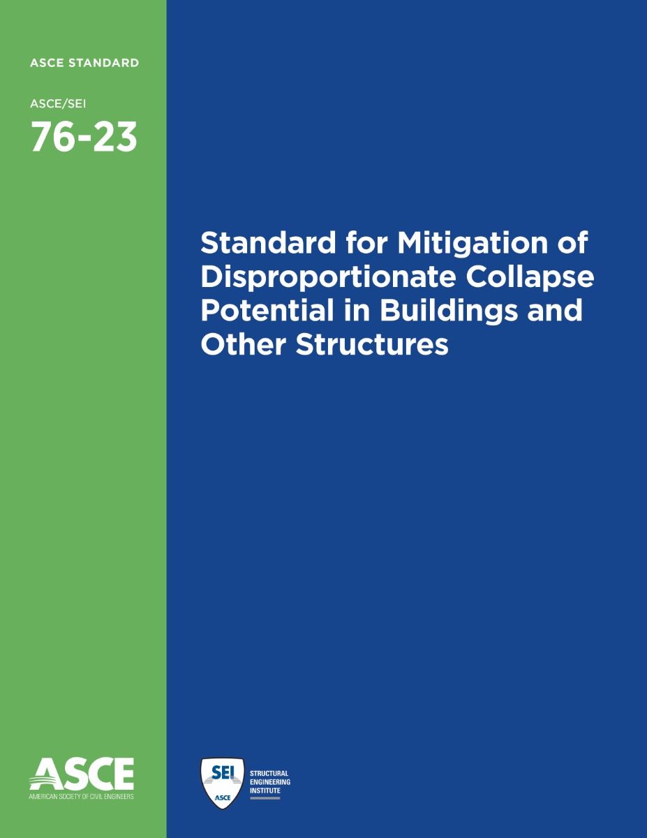 Standard for Mitigation of Disproportionate Collapse Potential in Buildings and Other Structures, ASCE/SEI 76-23, provides a consensus perspective for mitigating disproportionate collapse. It describes minimum requirements for planning, assessment, analysis, material selection, design and detailing, construction, and qualification testing to mitigate disproportionate collapse of new and existing buildings and other structures.